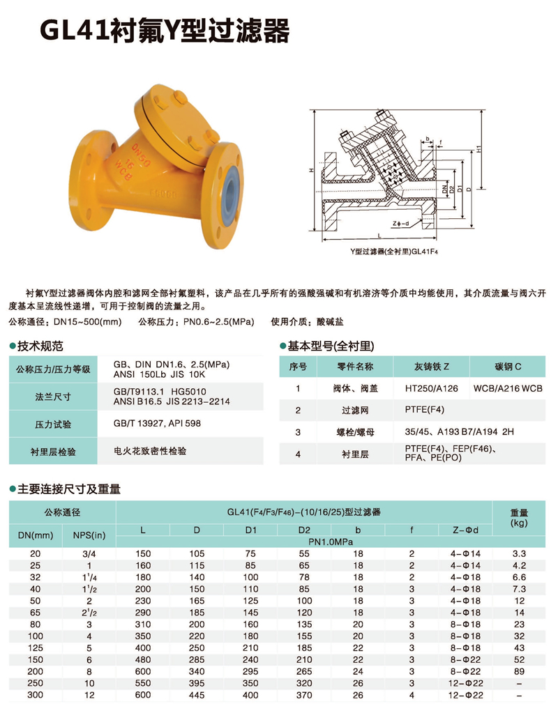 GL41F46-16P不锈钢衬氟Y型过滤器