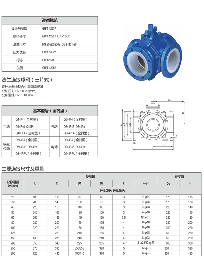 Q44F46-16P不锈钢衬氟三通球阀