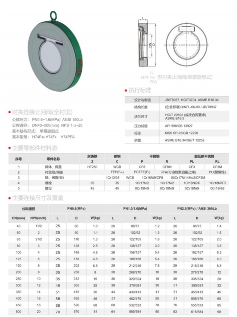 H74F46-16C对夹式衬氟止回阀